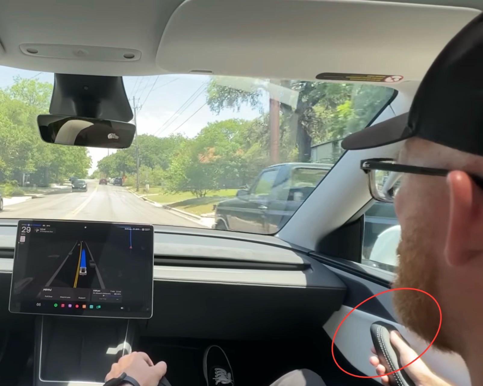 In the video that shows the RoboTaxi making a mistake and correcting itself, the passenger monitor person has their hand on the handle, but not on the button. Thought that moment was interesting.
