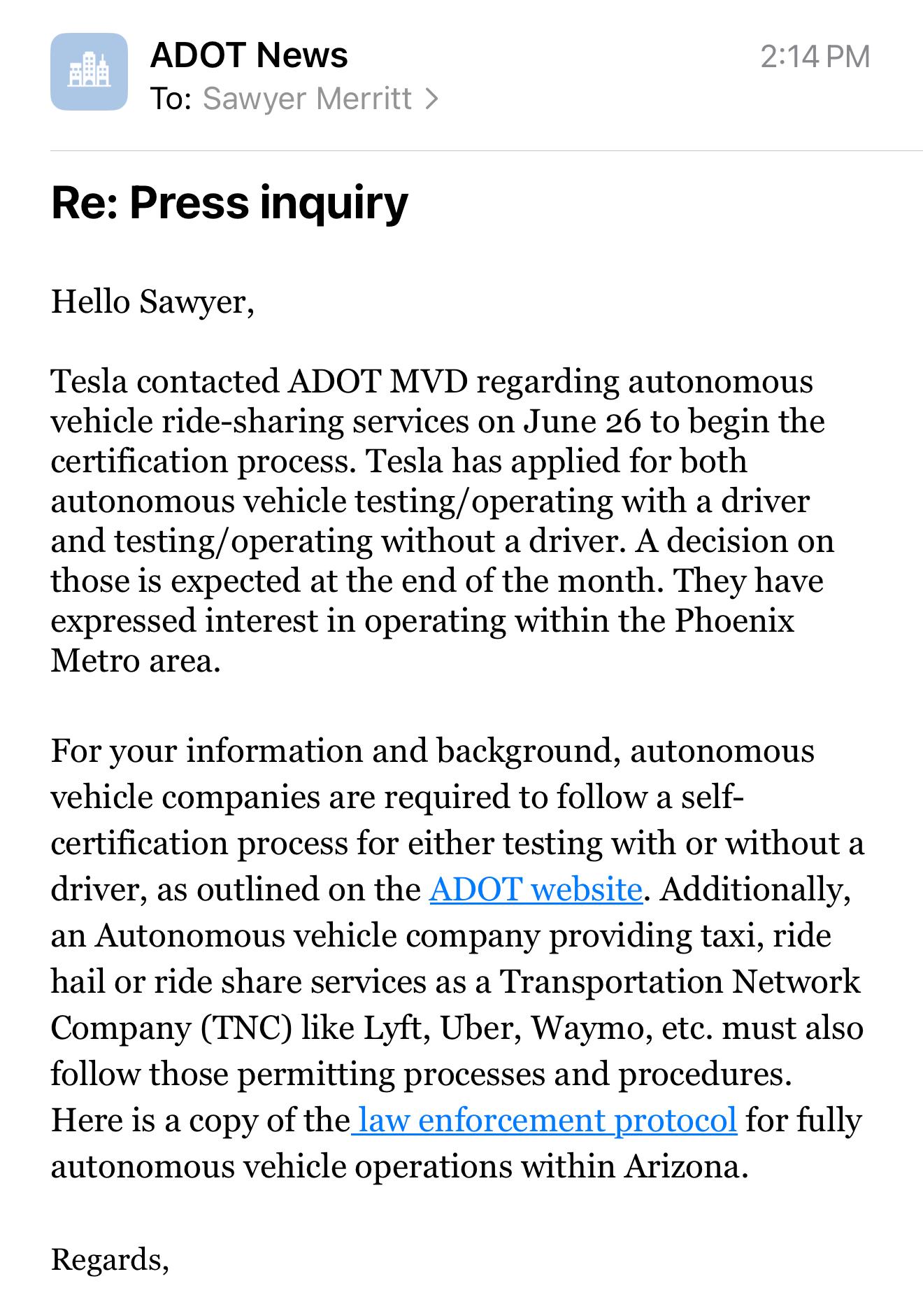 [https://x.com/SawyerMerritt/status/1943374162766041482](https://x.com/SawyerMerritt/status/1943374162766041482) Sawyer Merritt on X "confirmed directly with the Arizona Department of Transportation that Tesla reached out to them on June 26th to begin the certification process to operate an autonomous Robotaxi service in the state."