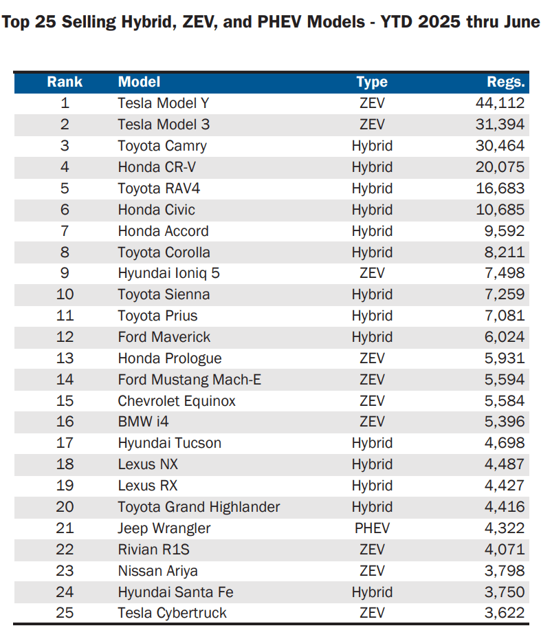 This quarter the CNCDA added hybrids to their quarterly report which previously only had ZEV and PHEV and Tesla still held the top 2 slots, beating the Toyota Camry, Honda CR-V and RAV4 hybrids with both the Model 3 and the Model Y. https://preview.redd.it/2jx1dcqbmjef1.png?width=787&format=png&auto=webp&s=0d7778cff65977029c6942c956f439ae321ec83c [https://www.cncda.org/wp-content/uploads/Cal-Covering-2Q-25.pdf](https://www.cncda.org/wp-content/uploads/Cal-Covering-2Q-25.pdf) Previous Q1 report for comparison: [https://www.cncda.org/wp-content/uploads/Cal-Covering-1Q-25.pdf](https://www.cncda.org/wp-content/uploads/Cal-Covering-1Q-25.pdf)