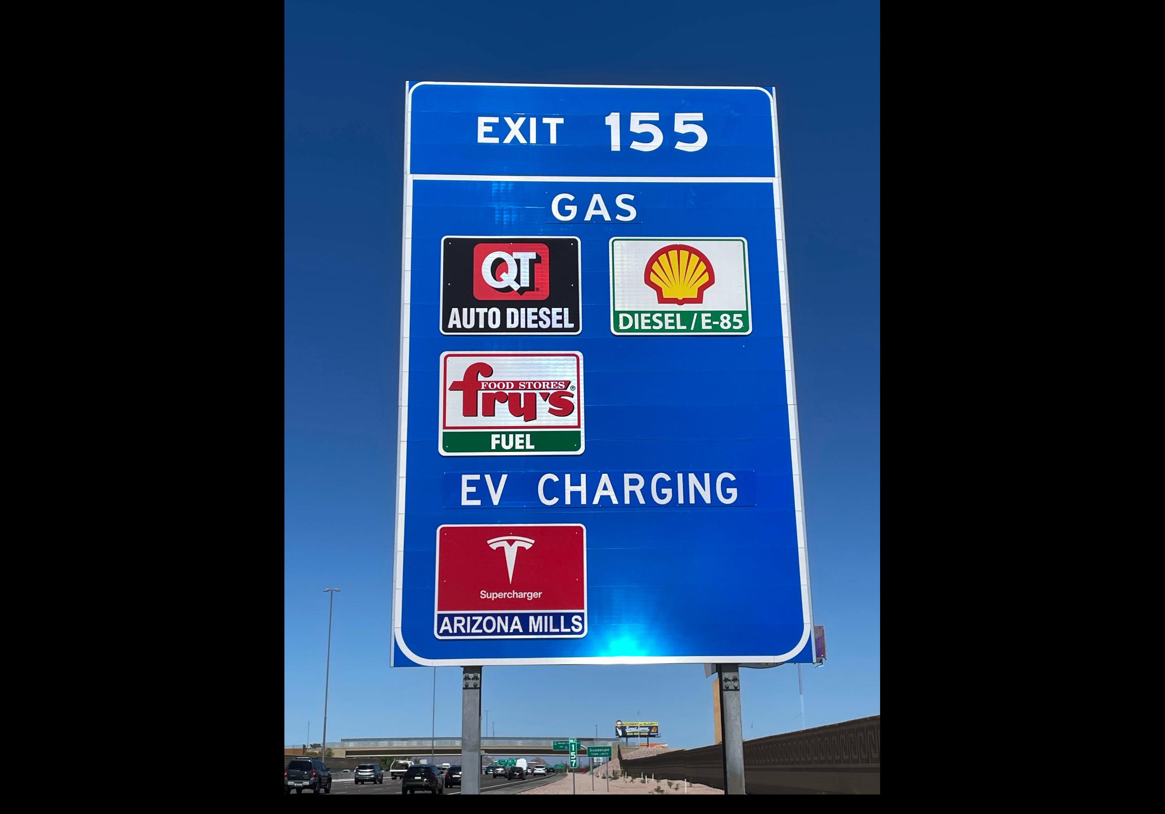 Until now, though, I have never seen a category other than gas, food, lodging, or attractions. There are even strict guidelines about the order those categories need to show up as you approach the exit. Presumably, Tesla would have had to put their sign under the "gas" category, which is... weird. (And now that I think about it, diesel isn't considered "gas" either so that's in the wrong category too. Why don't they just change the category to "fuel"?)