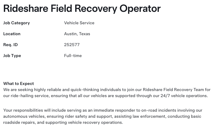 Just saw this new job posting today. This only makes sense if the safety observer is going to be removed soon. Here's a link to the full listing: [https://www.tesla.com/careers/search/job/rideshare-field-recovery-operator-252577](https://www.tesla.com/careers/search/job/rideshare-field-recovery-operator-252577)