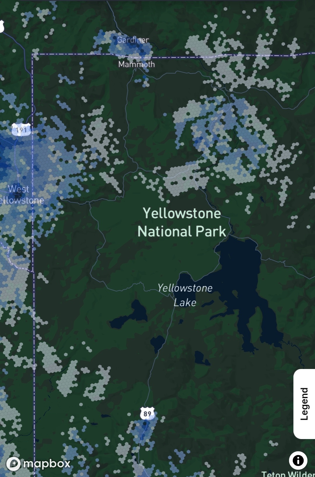 Yellowstone has virtually no coverage. During tourist season it's at capacity and disconnects frequently even in the spots with coverage on this map. Maps will not work without cellular unless you know the specific street address. Can't just enter "Old Faithful" and navigate there. https://i.imgur.com/dvWhqHv.jpeg
