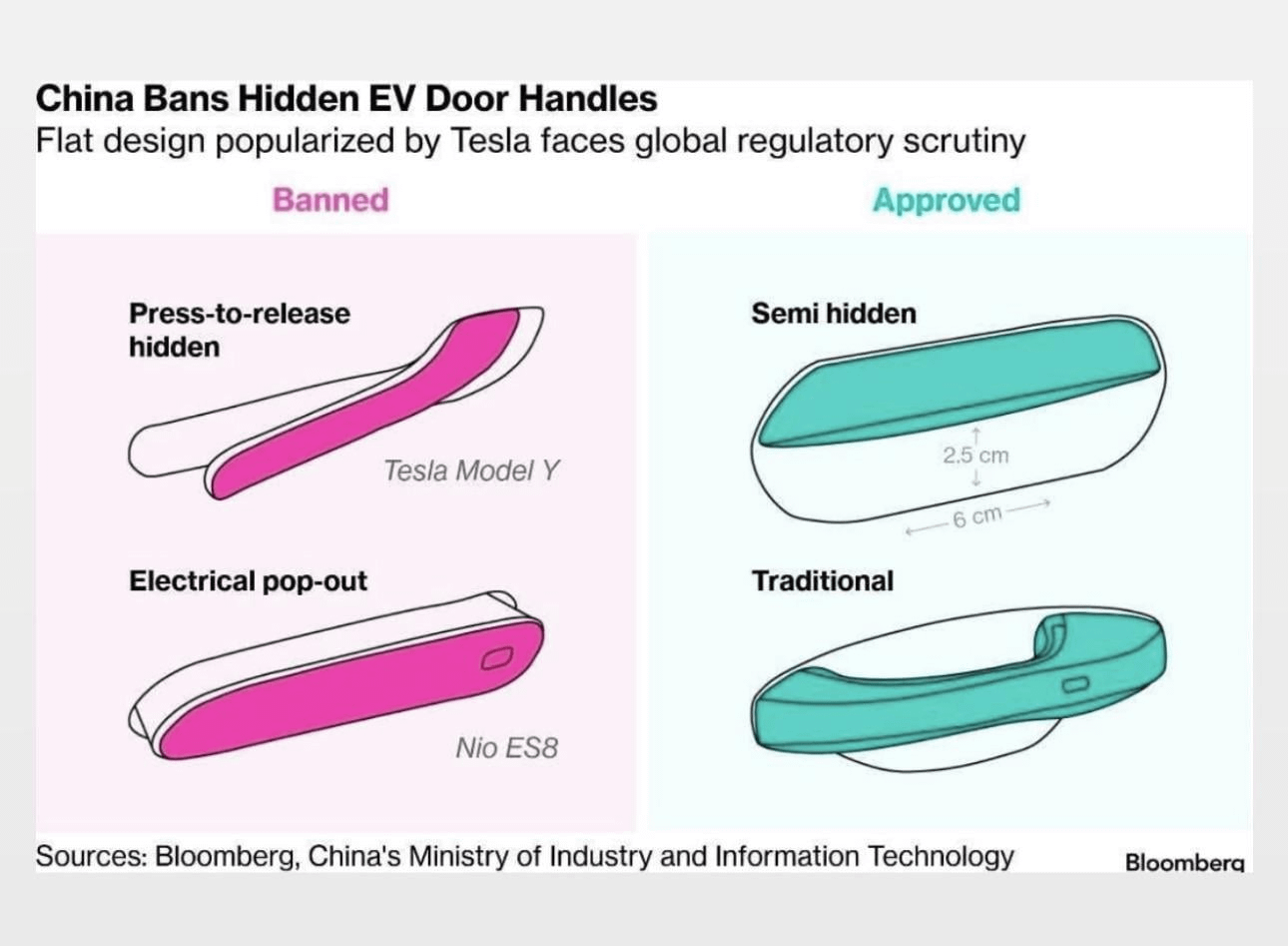 Exterior handles can’t be fully flush under the new rules. The 3/Y exterior handles would not comply with this part of the rule (from Bloomberg’s article): > On the door’s exterior, there must be a recessed space measuring at least 6 centimeters by 2 centimeters (2.4 inches by 0.8 inches) for a hand to grasp a handle.