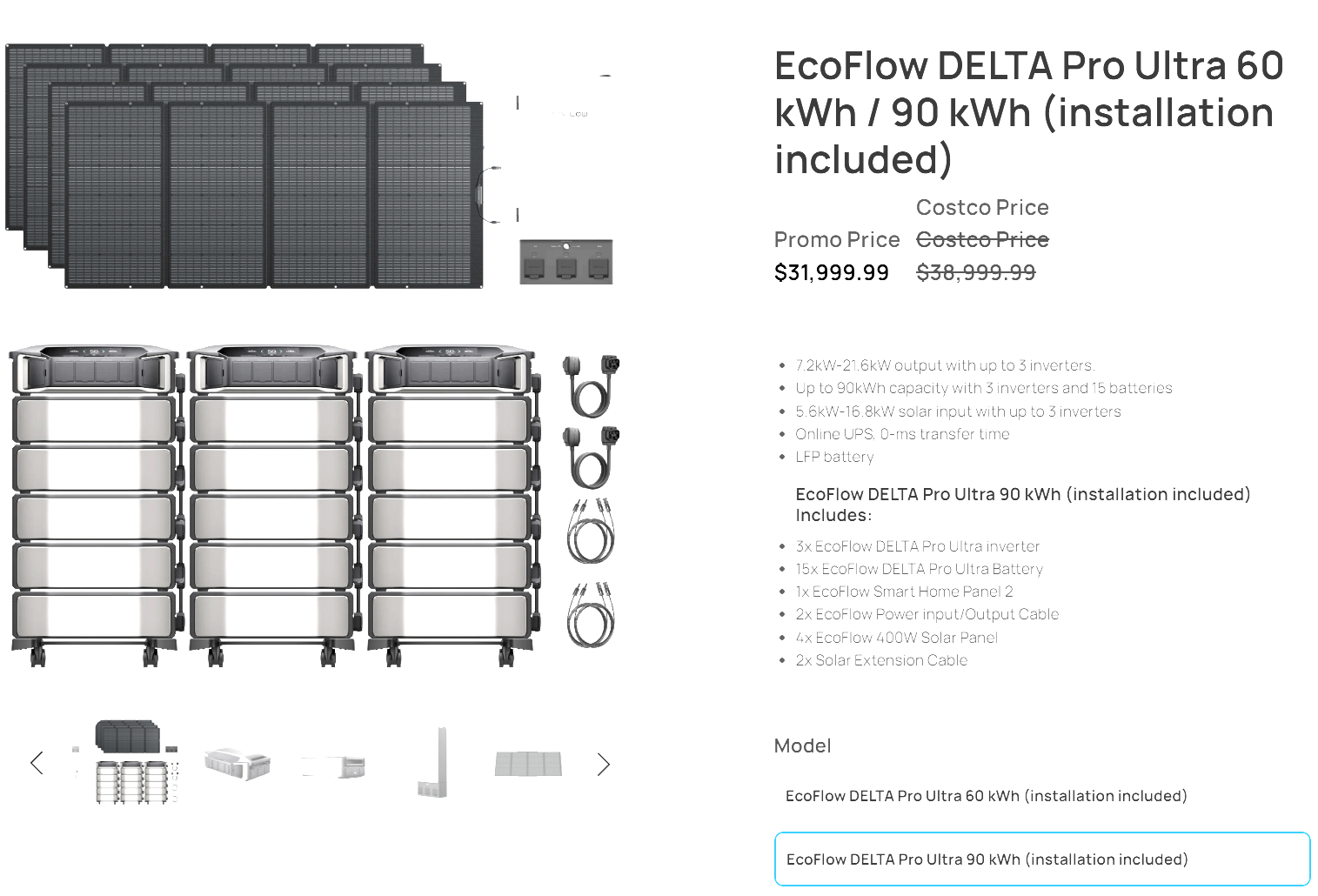 [https://costco.ecoflow.com/products/copy-of-ecoflow-5kwh-power-kits-dpu-60-90?variant=47801208635688](https://costco.ecoflow.com/products/copy-of-ecoflow-5kwh-power-kits-dpu-60-90?variant=47801208635688) The bundle Includes: * 3x EcoFlow DELTA Pro Ultra inverter * 15x EcoFlow DELTA Pro Ultra Battery (6kwh\*15 = 90kwh) * 1x EcoFlow Smart Home Panel 2 * 4x EcoFlow 400W Solar Panel * Professional installation Current price $32k, was $28k during black friday when I bought it. Possibly still eligible for 30% tax credit. If the image looks washed out, its because I took a screenshot on an HDR monitor. https://preview.redd.it/37jz7n6nagng1.png?width=1515&format=png&auto=webp&s=63f080635edbed777a7512a53b722c20bdd7b358