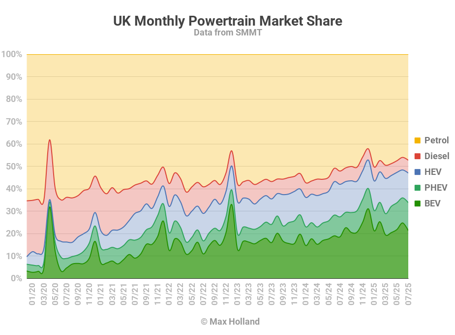 What's this conspiracist nonsense, vehicle registrations are public data. The UK EV market share has been steadily rising for years as fleet CO2 emission targets tighten https://cleantechnica.com/2025/08/06/evs-take-33-8-share-of-the-uk-government-bungles-incentives/ https://cleantechnica.com/wp-content/uploads/2025/08/UK-Monthly-Powertrain-Market-Share.png