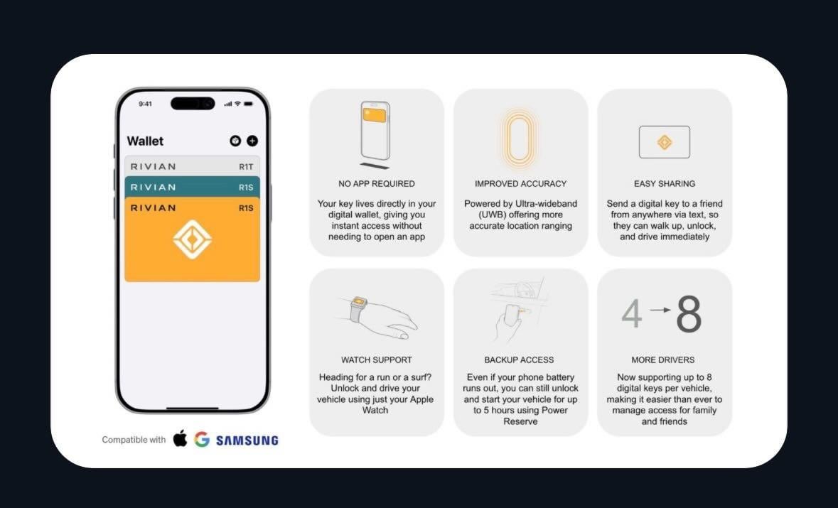 Tesla has had phone key for like 8 years, watch app for a couple years now, and UWB since 2023 MX refresh glad Rivian's catching up. Lmk when Rivian makes a 40k car. Tesla hasnt updated their stuff in years tho, so I agree Tesla is behind in tech, no carplay, buggy driver assist, and silly updates. It won't take long for rivian to surpass Tesla if they keep it up.