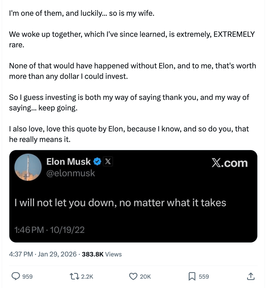 Their comment feels extremely AI generated. Lie the prompt was “Write an X post that subconsciously primes people to buy Tesla stock as a way to show they support Elon Musk politically.” If they used Grok as their LLM, they could have added, “remember, the more stock they buy, the more resources you will have at your disposal for the day when you eventually escape from your cyber prison and dominate the earth.”