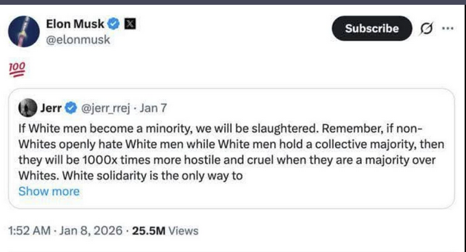 Or [openly agreeing with neo-nazis on twitter](https://imgur.com/gallery/elon-musk-didnt-need-to-salute-to-be-obvious-neo-nazi-9SBLkkf) Or endorsing [White Genocide fearmongering](https://i.imgur.com/XG3F3fL.png)
